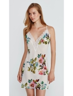 Noční košilka vyrobená z měkké květinové tiskové krepové tkaniny na bílém pozadí s jemnou páskou. Zkřížené popruhy.